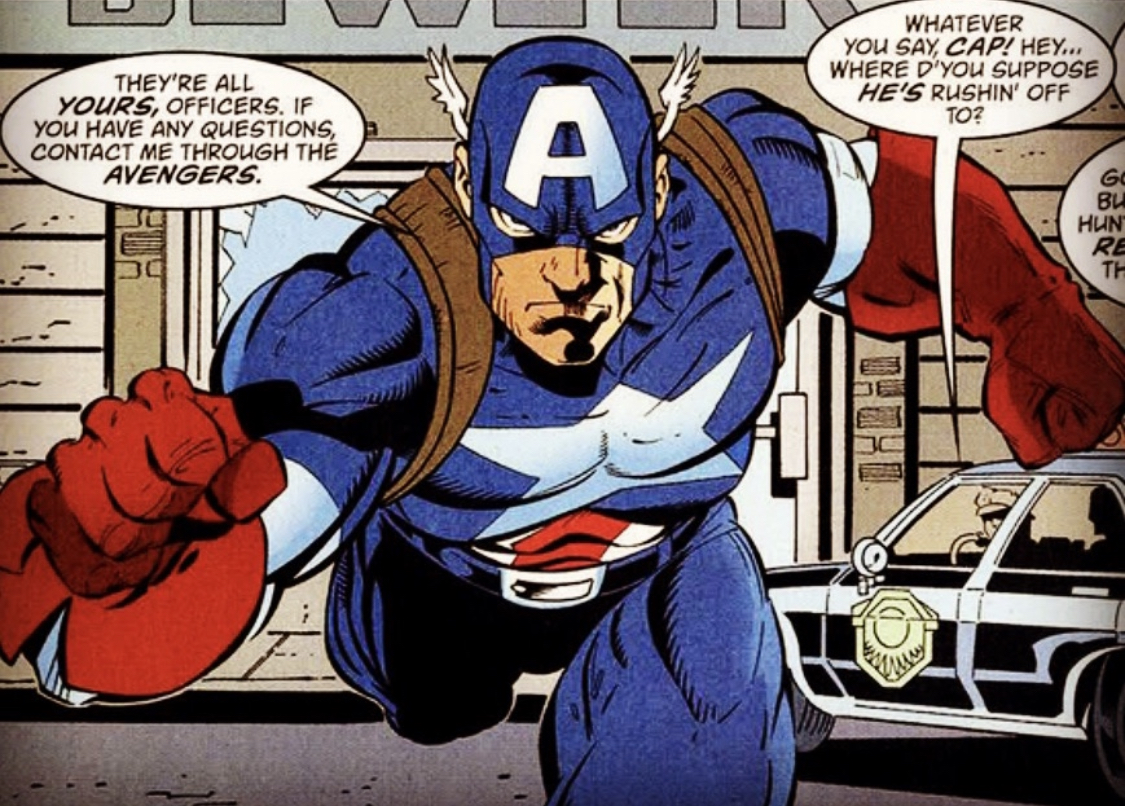 CAPTAIN AMERICA! From Marvel Comics CAPTAIN AMERICA vol. 3 issue 35. Pencils: Dan Jurgens, Inks: Walden Wong, Colors: Gregory Wright, Letters: Todd Klein.