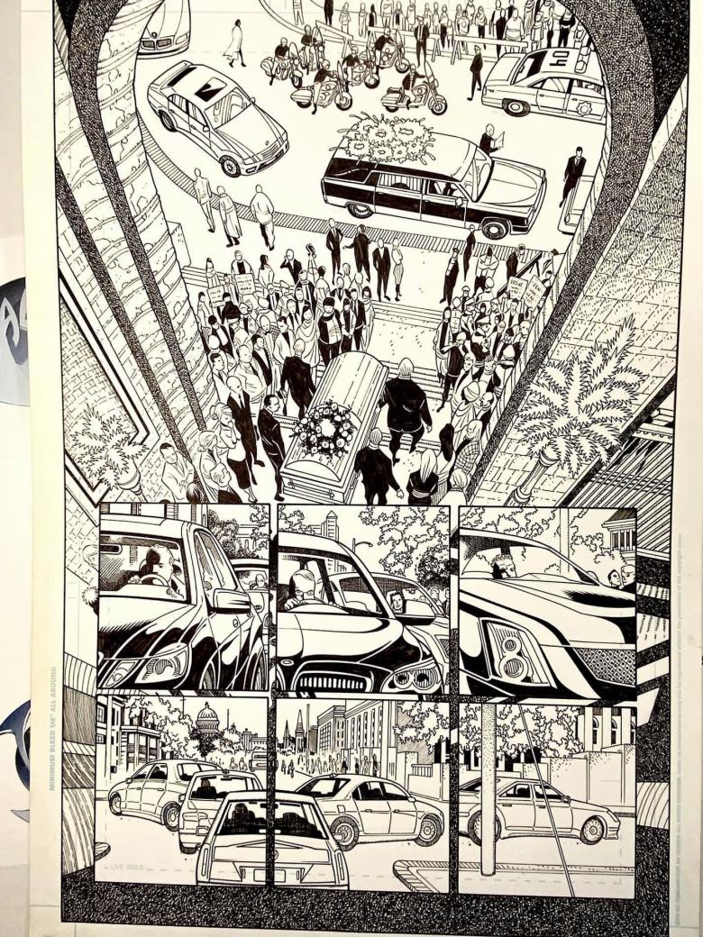 MR. JUSTICE. Shelved project from DC Comics. When I took on this project, I decided to not fill in ANY black areas in backgrounds. Instead, I rendered everything instead. Pencils: J. Rivera, Inks: Walden Wong.