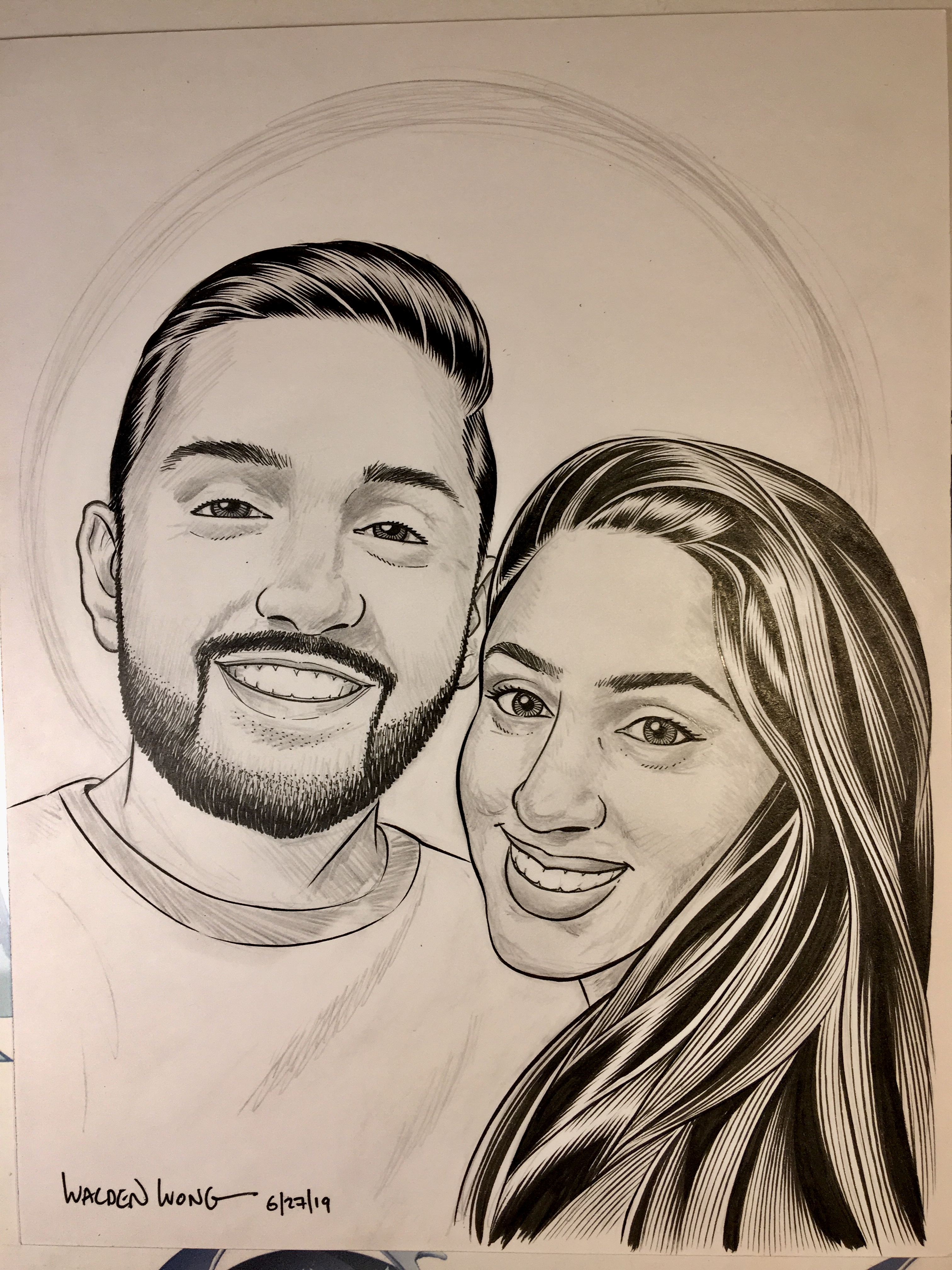 Private portrait commission of a beautiful couple. Pencils and inks by me.